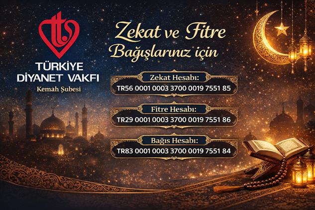 Ramazan ayının bereketini ve huzurunu hep birlikte yaşarken; ihtiyaç sahiplerini de unutmuyoruz. Türkiye Diyanet Vakfı Kemah Şubesi olarak zekât, fitre ve bağışlarınızı güvenle ulaştırabileceğiniz hesaplarımızı sizlerle paylaşıyoruz.